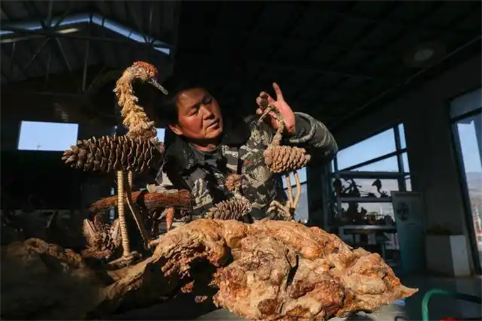 “案子上做的是果殼錦雞,它的原材料很簡單,主要是由大松果、橡子殼、麻繩輔以鐵絲制作而成,顧客非常喜歡,銷路很好。鄉(xiāng)土味的工藝品市場前景很好,行情好的時候一年能賣到30多萬元。”駱彥紅邊做邊說。