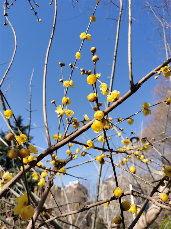 綠陰公園內(nèi)栽植有素心、虎蹄、金鐘、磬口、狗牙等多個品種、900余株蠟梅,或沿公園游路列植,或在綠地內(nèi)片植、叢植,或分布于南門和西北門廣場的主題立體花壇內(nèi)。