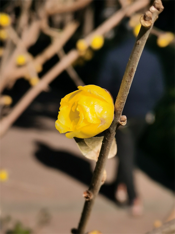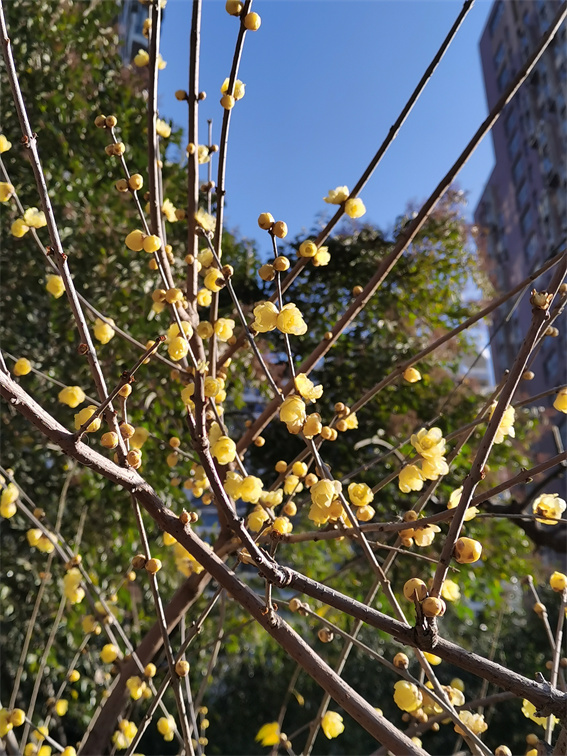 特別值得一提的是,綠蔭公園有18株素心蠟梅,為蠟梅中最寶貴的品種。其花色純黃,濃香撲鼻,凌霜傲雪,迎寒綻放,花黃似蠟,其香味有幾分似茉莉,又帶些沉香的氣息。
