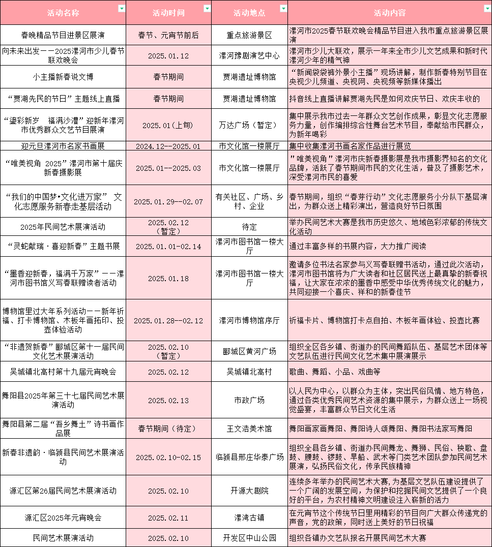 漯河市名家書畫展、“唯美視角2025”漯河市第十屆慶新春攝影展將分別在市文化館展出;“我們的中國夢·文化進(jìn)萬家”文化志愿服務(wù)新春走基層活動“春芽行動”文化志愿服務(wù)小分隊將下基層演出,為群眾送上精彩節(jié)目,營造良好節(jié)日氛圍;2025年民間藝術(shù)展演活動、“靈蛇獻(xiàn)瑞·喜迎新春”主題書展、“墨香迎新春 福滿千萬家”——漯河市圖書館義寫春聯(lián)贈讀者活動、市博物館里過大年系列活動,都將讓人民群眾感受到濃濃的文化年味。
