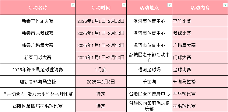 節(jié)日期間,漯河市還將舉辦空竹龍大賽、市民籃球賽、廣場舞大賽、門球大賽、2025年舞陽縣足球邀請賽、臨潁縣迎新春環(huán)湖馬拉松賽、“乒動全力活力無限”乒乓球比賽、召陵區(qū)第四屆羽毛球比賽等群眾體育賽事,讓廣大人民群眾在家門口觀賞到精彩的體育賽事。