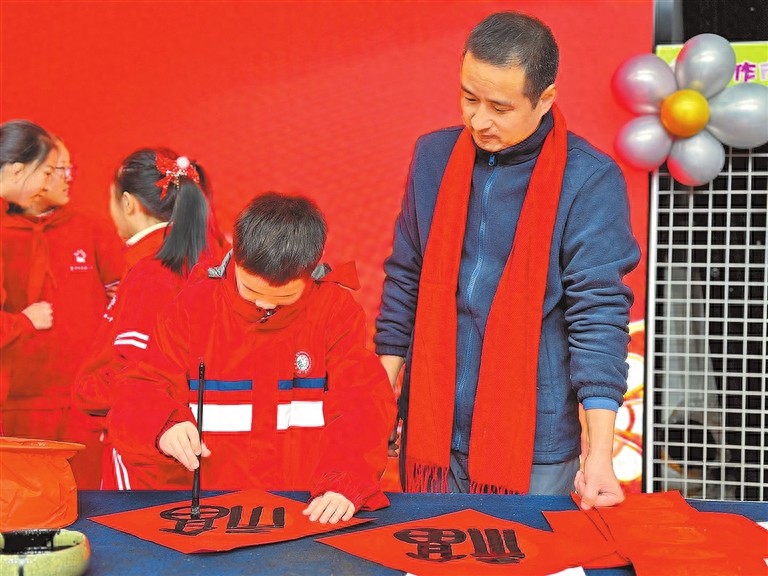 1月7日,在“2025河南文藝界新春歡樂行”焦作分會(huì)場(chǎng),書法家與小學(xué)生們自由“組隊(duì)”,鋪展紅紙,一停一頓、一起一落間,一幅幅寓意吉祥的“福”字在他們筆下綻放。 姬姣姣 攝