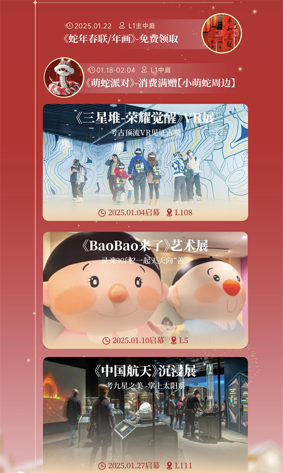 即日起,三星堆——榮耀覺醒VR、BaoBao來了藝術(shù)展、《中國航天沉浸展》等華北首展盛大開展;小年夜開啟新光市集春聯(lián)免費(fèi)贈領(lǐng);更有大年初一醒獅納福、大年初二財(cái)神送福、燈火新光巡萬象——元宵巡游等活動(dòng),新春氛圍感拉滿。