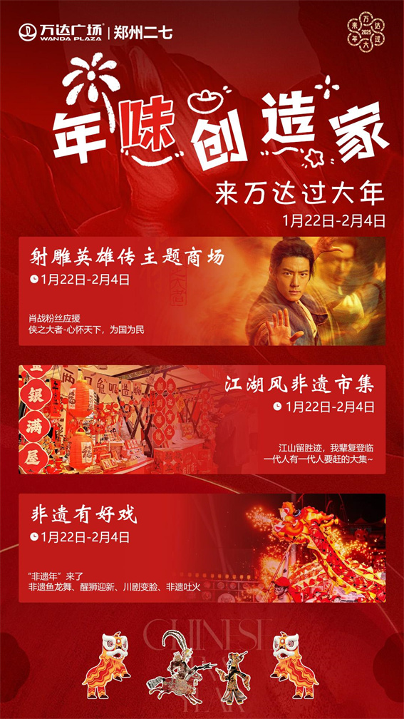 聯(lián)合省非遺民俗傳承人舉辦的由皮影戲、糖畫油紙燈籠、掐絲琺瑯、手工團(tuán)扇等組成的“巳巳如意”非遺市集要在二七萬達(dá)開市了!還有新春游園會、“醒獅送福·獅來運(yùn)轉(zhuǎn)”、魔法秀——氣球小丑大作戰(zhàn)、非遺川劇變臉、《射雕英雄傳》主演應(yīng)援主題活動(dòng)等,為市民帶來春節(jié)購物新體驗(yàn)。