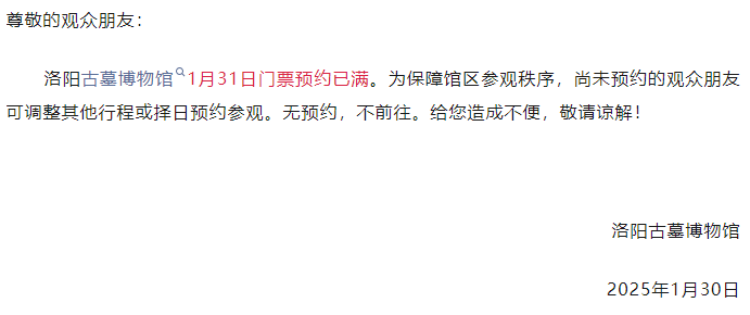 溫馨提示:洛陽古墓博物館1月31日門票預(yù)約已滿