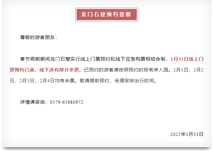 您的當(dāng)前位置:網(wǎng)站首頁 > 出行資訊 > >龍門石窟預(yù)約門票溫馨提示