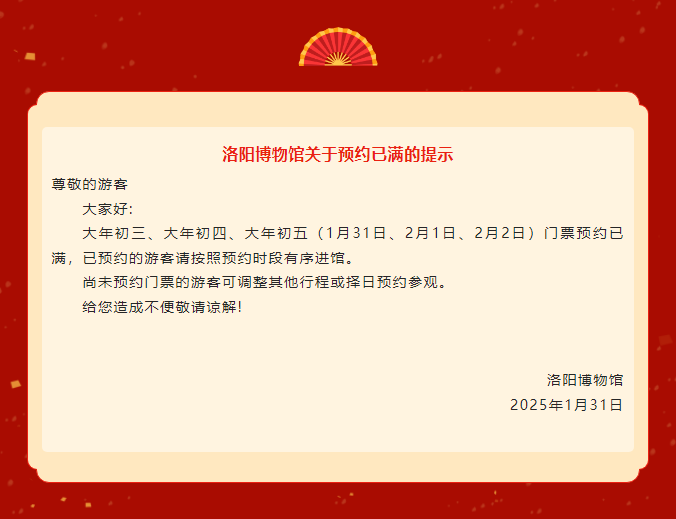洛陽博物館關于大年初三至初五門票預約已滿的提示