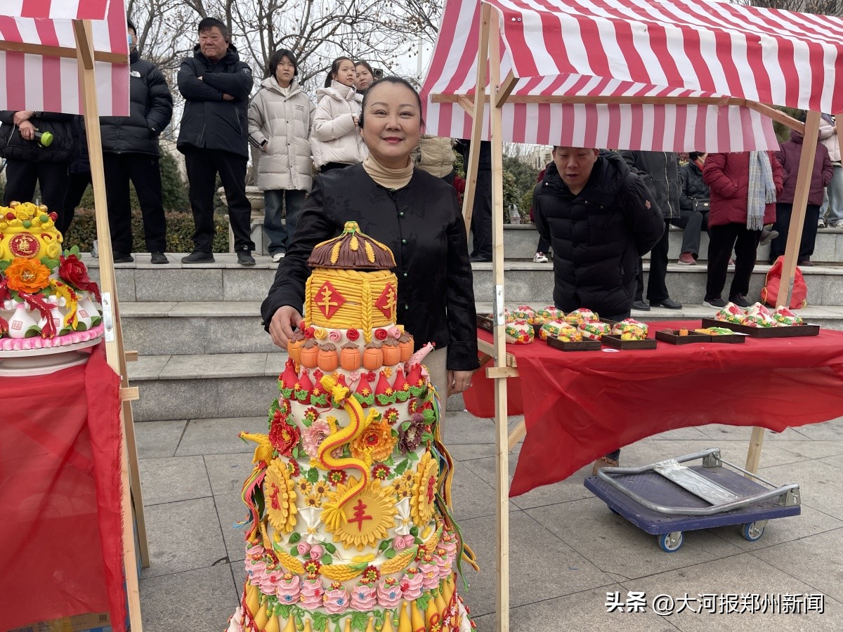 “這個(gè)花饃是用80斤面粉制作出來(lái)的,用了一周時(shí)間。”采訪中,記者在活動(dòng)現(xiàn)場(chǎng)還看到一些省、市、區(qū)級(jí)非物質(zhì)文化遺產(chǎn)的集中展示,有糖畫(huà)、烙畫(huà)、花饃、泥人、剪紙等多種非遺技藝,其中一個(gè)巨大的塔狀花饃吸引了眾人圍觀。該花饃的制作者劉春枝告訴記者,她今年50歲,是非物質(zhì)文化遺產(chǎn)花饃制作的第四代傳承人。此次展出的這個(gè)大型的“五谷豐登”花饃,用了80斤的面粉,上下共十層,第一層是個(gè)糧倉(cāng),里面裝有糧食和瓜果蔬菜。第二層是一圈玫瑰花,第三層是石榴、葡萄,第四層是牡丹花,第五層是向日葵,第六層是麥穗,第七層是祥云,第八層是寶葫蘆,第九層是壽桃,第十層是黃金玉米。層與層之間有龍鳳等穿插,造型各異,栩栩如生。
