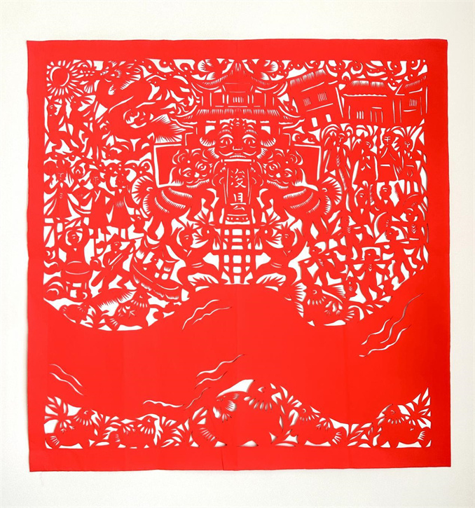河南省非遺代表性項目民間剪紙(孟津剪紙)省級代表性傳承人暢楊楊也在屏幕前觀看了直播,并創(chuàng)作了一幅精美的剪紙作品,巧妙融入了泥咕咕、舞龍、舞獅、背閣等?h正月古廟會的特色元素。
