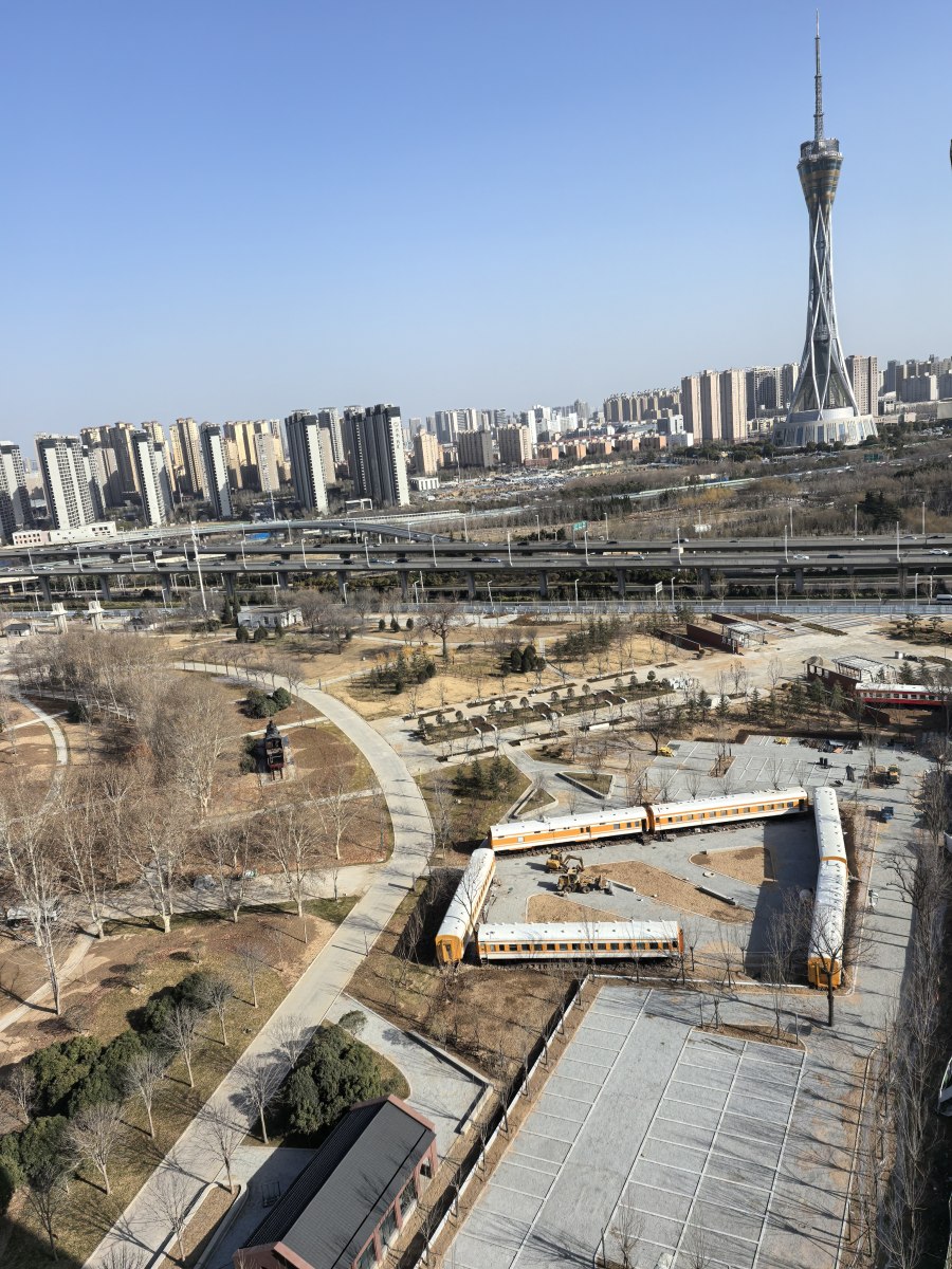 鏡頭拉近,可見公園保留了宋慶齡專列火車并且重新刷漆翻新。公園中心位置新建了一處圓形的廣場,廣場中心是一座鼎,公園西部的湖泊水系上的棧道框架已搭建完成,尚未引入水源。一些廊架、智慧健身器材已布局好。