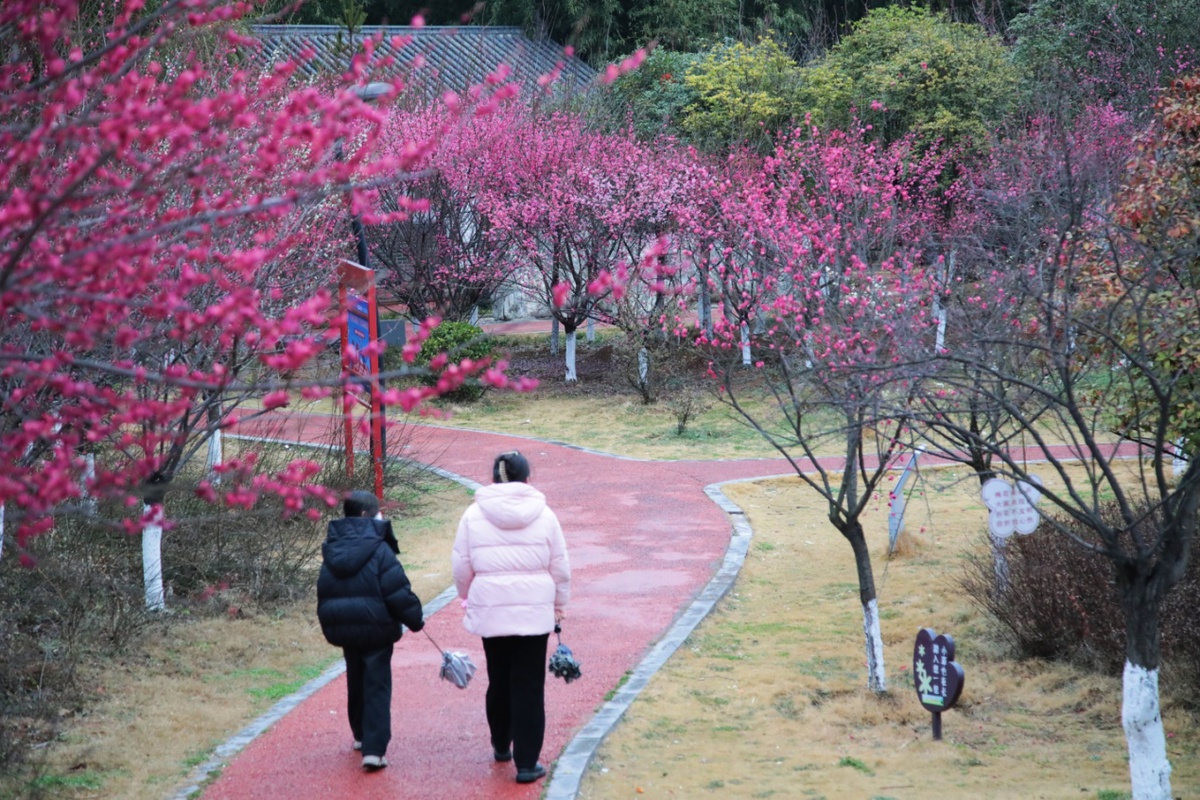 園內(nèi)花影灼灼,林間游客熙攘,一派春日佳景。人們或是漫步在梅林間,欣賞著梅花的嬌艷;或是拿起相機(jī),記錄下這美好的瞬間;還有的人坐在長(zhǎng)椅上,靜靜地感受著春天的氣息。每年梅花盛開之際,都會(huì)吸引眾多市民和攝影愛好者前來觀賞、拍照,欣賞著梅花的綽約風(fēng)姿。