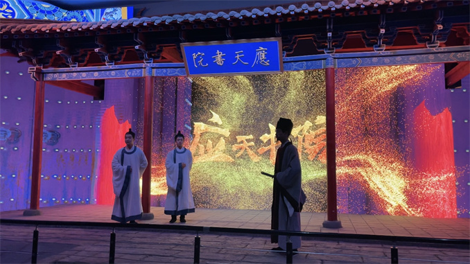 活動現(xiàn)場,通過精彩的演繹,展現(xiàn)了商丘文旅的獨特風(fēng)情。在南門水系的全息+水上+古詩+復(fù)原實景演繹《梁園吟》,將觀眾帶入了詩中的意境,感受古人的浪漫與才情。