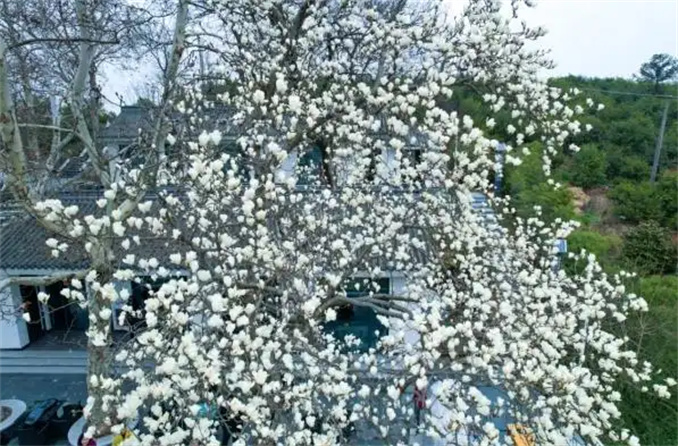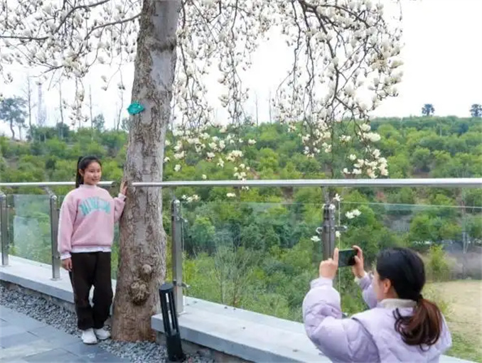 3月9日,春風(fēng)輕拂。位于光山縣司馬光油茶園的白蘭茶舍院內(nèi)和周邊的玉蘭花嬌艷嫵媚,吸引了眾多游客前來(lái)。白蘭茶舍院內(nèi)的兩棵玉蘭樹(shù)栽植于20世紀(jì)60年代末,樹(shù)齡已超過(guò)50年。2022年,司馬光油茶園景區(qū)將原槐店鄉(xiāng)晏崗村林場(chǎng)的護(hù)林房改建為白蘭茶舍,為游客提供游玩、觀景、賞花的休憩場(chǎng)所。同時(shí),茶舍周邊的道路和水塘旁栽植了新的玉蘭樹(shù),今年已進(jìn)入盛花期,成為園區(qū)的新亮點(diǎn)。
