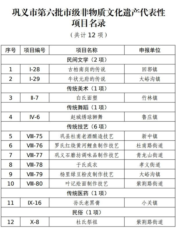 近日,鞏義市人民政府公布了第六批市級非物質(zhì)文化遺產(chǎn)代表性項(xiàng)目名錄,古柏南崗的傳說、白氏面塑、趙城繡球獅舞、葉記燴面制作技藝等12個非遺項(xiàng)目名列其中。這些入選的項(xiàng)目亮點(diǎn)紛呈,彰顯了隱藏在鞏義民間的技藝魅力,展現(xiàn)了鞏義地方風(fēng)情和人文底蘊(yùn),一起來看看都有哪些吧!
