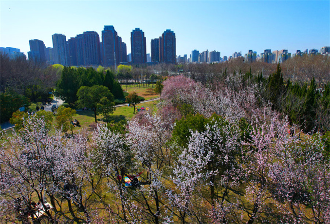 鄭州之林內(nèi)的紫葉李花開正艷。