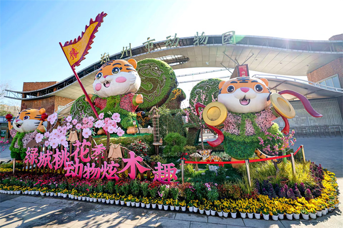 在鄭州市動(dòng)物園大門廣場(chǎng),占地120平方米的《桃源木色》花壇,以園林木質(zhì)動(dòng)物、房子、架子為主體背景,搭配三只老虎裝飾造型,點(diǎn)綴桃花、蘑菇、人物等元素,形成一組靚麗、充滿創(chuàng)意木趣的圖景,營造出和風(fēng)微煦、蝴蝶翩翩、桃花盛開的春意氛圍感。在園區(qū)主干道入口、貘館前、大象房西則分別打造《歡樂萌境》《桃你喜歡》《桃前象語》等景點(diǎn),營造春意盎然、童趣美好的氛圍。