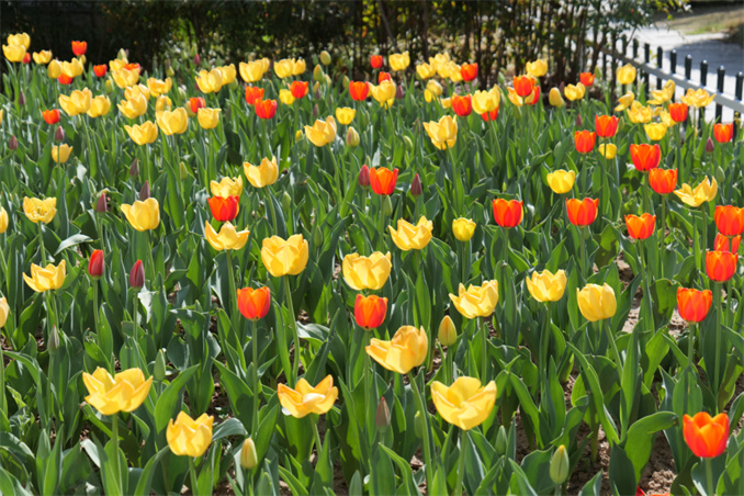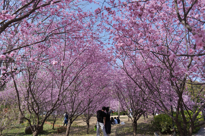 砌下落梅如雪亂,拂了一身還滿。走進(jìn)綠博園賞花區(qū),首先映入眼簾的就是一株株盛放的美人梅,滿樹粉紅如云似霞,微風(fēng)拂過,一片片花瓣簌簌而落,飄附在樹下游人身上。碧空下的玉蘭花朵朵如玉,高綻枝頭如優(yōu)雅仙子。道路兩旁,一叢叢金黃的金鐘花沿路鋪展,艷陽下格外耀眼。還有正開的郁金香、初綻的海棠、欲放的碧桃……繁花似錦、滿園芳香,又有燕語喃喃,鶯聲嚦嚦,蝶舞翩躚,蜂兒忙趁。