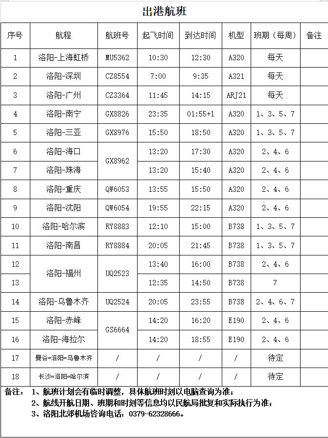 南方航空:洛陽(yáng)=廣州 每日一班,洛陽(yáng)=深圳 每日一班