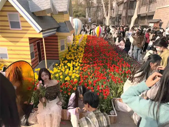 鄭州人民公園的郁金香展吸引了大批游客,公園內(nèi)人頭攢動。櫻花樹下,不少人在這里打卡、留影。