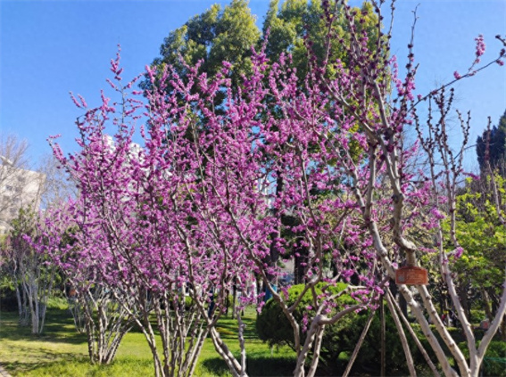 風(fēng)吹紫荊樹,色與春庭暮。柔情春三月,走進(jìn)紫荊山公園,滿滿的浪漫氣息撲面而來。園區(qū)內(nèi)種植的本地紫荊、紅花紫荊、白花紫荊、加拿大紫葉紫荊、黃山紫荊、垂枝紫荊、湖北紫荊、巨紫荊、羊蹄甲、金葉紫荊10個(gè)品種共計(jì)7000余株,如施粉黛霞披,競(jìng)相綻放,滿枝嫣紅,近看似火,遠(yuǎn)望如霞。