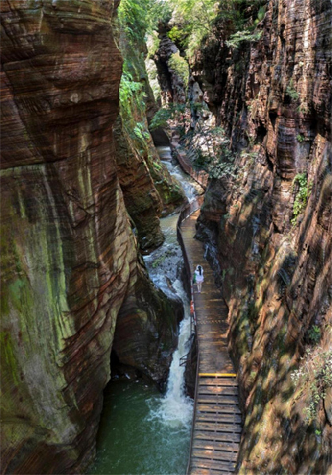 除了牡丹文化節(jié)的特色活動,這里的4K級無修春天“濾鏡”也值得打卡,龍?zhí)洞髰{谷是一條以典型的紅巖嶂谷群地質(zhì)地貌景觀為主的峽谷景區(qū),進(jìn)入峽谷,你可以邂逅自帶“裸眼3D”的奇石,這些石壁遠(yuǎn)看像刀切豆腐般齊整的赤紅巖壁,湊近了才發(fā)現(xiàn)藏著海浪狀的花紋,據(jù)護(hù)林員說這是12億年前的古海遺跡。