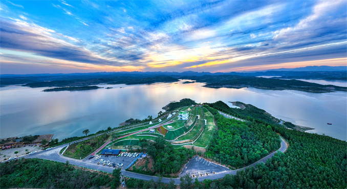 鷹嘴山海撥不到500米,登高俯瞰,湖光山色,萬(wàn)頃碧波,遠(yuǎn)山起伏的脊線(xiàn)倒映著平靜水面上。自小浪底庫(kù)區(qū)下閘蓄水后,幾百米落差的水岸,樹(shù)木茂密,綠蔭復(fù)蓋。淹沒(méi)區(qū)內(nèi)的一個(gè)個(gè)小山,與灣曲的水岸構(gòu)成一個(gè)個(gè)半島、水灣。