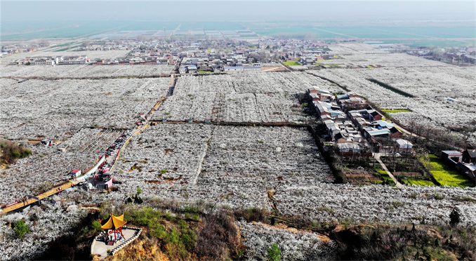 洛陽市孟津區(qū)會盟鎮(zhèn)的萬畝梨花在春風中開放,山野仿佛在一夜之間被“白雪”覆蓋,蔚為壯觀,吸引成千上萬的游客紛至沓來,賞花游玩,感受田園樂趣(3月26日攝)。當日,會盟鎮(zhèn)舉行了第十二屆黃河文化旅游季啟動儀式。