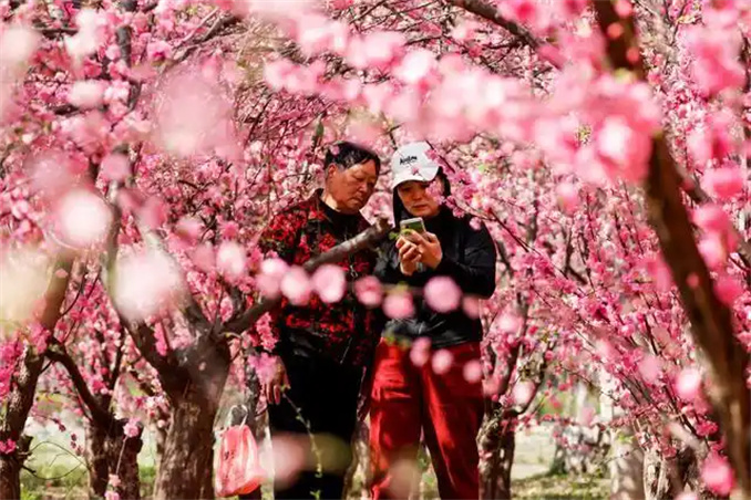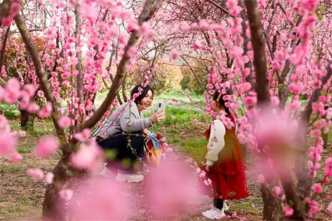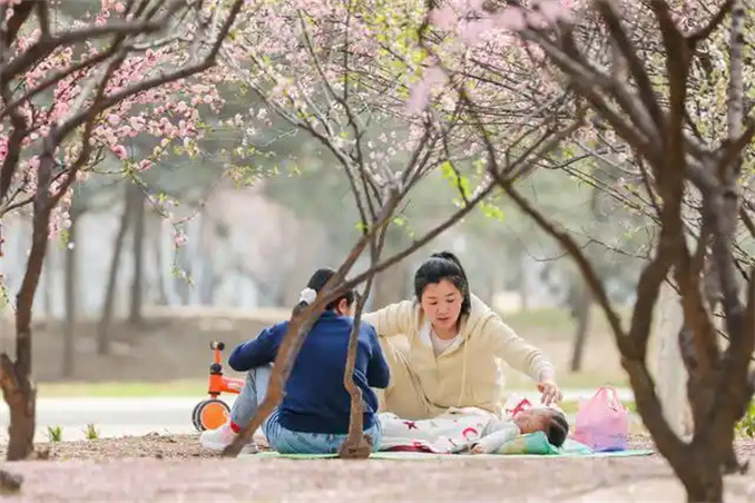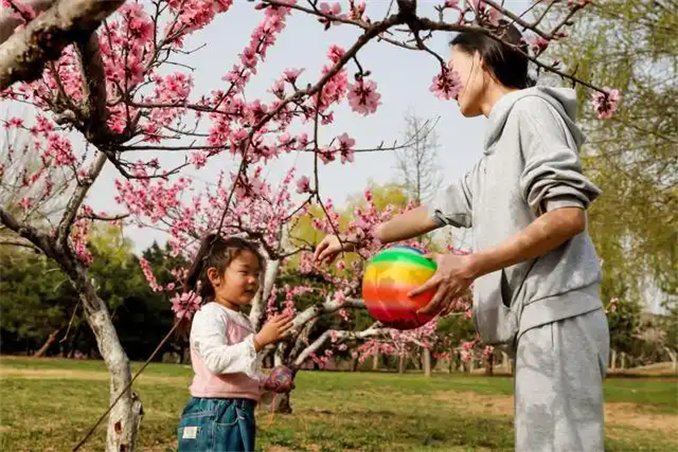 武陟縣覃懷公園,家長陪孩子在桃花園內(nèi)玩耍。