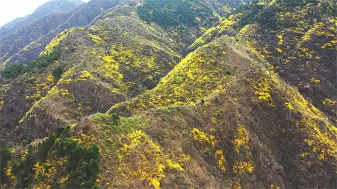 遠眺山野,金黃色的花海從淺山丘陵向深谷延展,千山染金、燦若云霞;近觀枝頭,簇簇黃花綴滿柔韌枝條,隨風搖曳,淡雅香氣氤氳山谷。