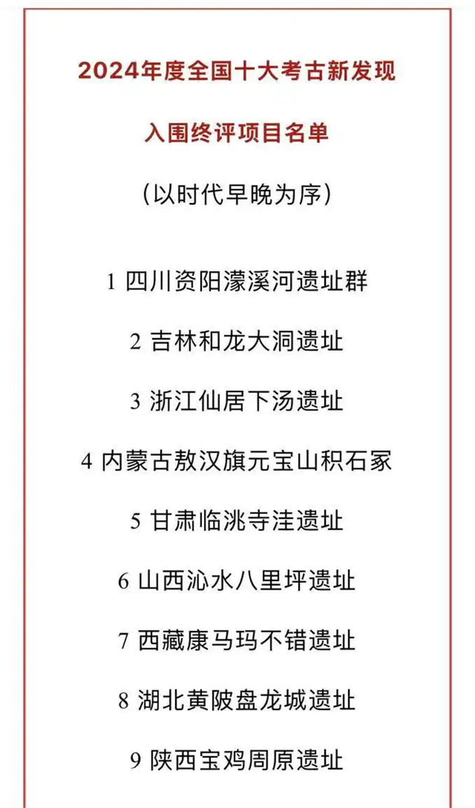 3月20日,2024年度全國(guó)十大考古新發(fā)現(xiàn)初評(píng)啟動(dòng)。候選項(xiàng)目均為各發(fā)掘資質(zhì)單位主動(dòng)申報(bào),經(jīng)國(guó)家文物局審核,最終確定30項(xiàng)參評(píng)。活動(dòng)辦公室組織投票推薦產(chǎn)生了20項(xiàng)進(jìn)入終評(píng)。