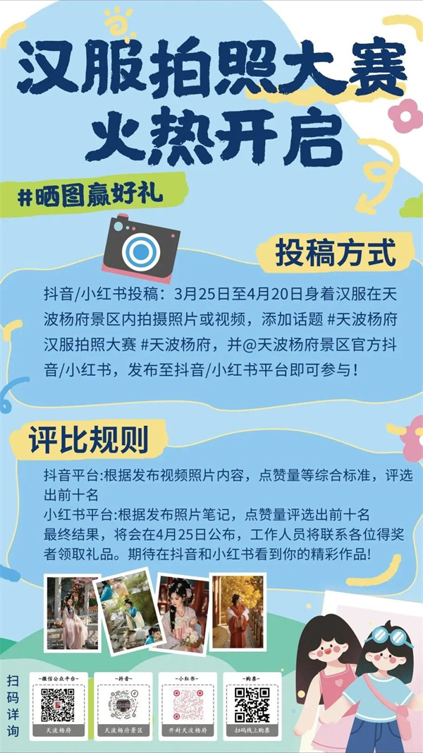 無論是優(yōu)雅端莊的大家閨秀風, 還是仗劍天涯的俠客風范, 只要身著漢服在景區(qū)內(nèi)留下美照, 上傳至指定平臺參與大賽, 就有機會贏取超值禮品。