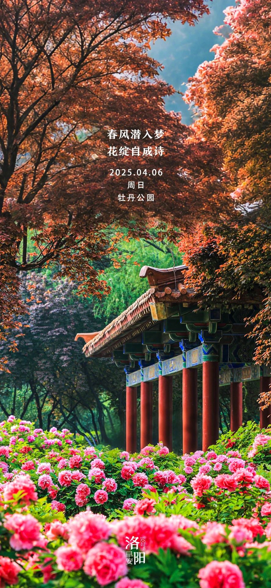 隋唐城遺址植物園:全園共有約360個(gè)品種牡丹開放,主要分布在九色園、百花園、科技園、特色園。其中:盛開的牡丹品種有富貴滿堂、種生紅、墊江紅、鳳嬋嬌、紫羅漢、杏花春雨等;初開的牡丹品種有白山黑水、晨輝、迎日紅、紅珠女、洛陽紅、彩霞等。此外,園內(nèi)菊花桃、紫荊、櫻花、海棠等競相綻放。
