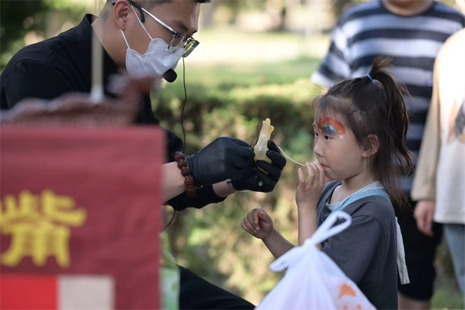 小朋友現(xiàn)場(chǎng)體驗(yàn)“馬大吹糖人”。