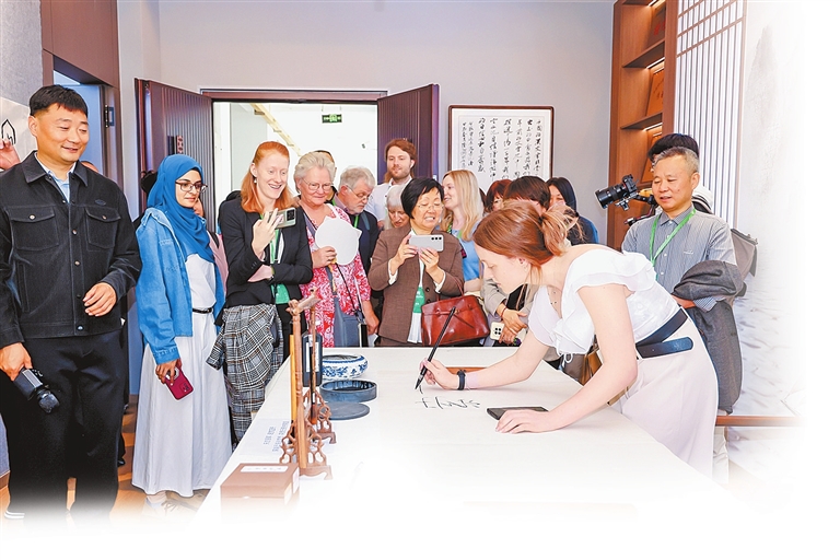 在中外嘉賓進(jìn)校園活動(dòng)中,外國(guó)友人正在學(xué)習(xí)中國(guó)書(shū)法。
