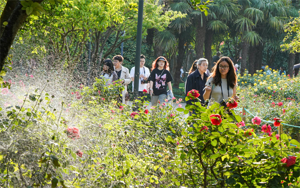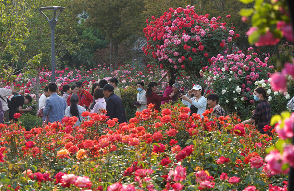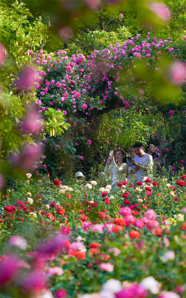 鄭州市月季公園集月季科研、觀賞于一體,園內(nèi)設(shè)置8個景區(qū),由南向北依次為:月季栽培展示區(qū)、月季品種園、引種培育區(qū)、盆景奇石展示區(qū)、月季文化演繹區(qū)、月季樹樁盆景栽植區(qū)、山水風光區(qū)、生產(chǎn)管理區(qū)。目前,園內(nèi)40萬株月季已次第綻放,姹紫嫣紅一片花海,是觀賞月季的最佳去處,西門口大花壇、月季景墻、東門內(nèi)月季花帶、南門附近月季花廊等,前來打卡的游客絡(luò)繹不絕;▓F錦簇的公園月季花廊東側(cè),還種植有一片月季同屬薔薇科的玫瑰,4月底開放,屆時,其嬌美的容顏、馥郁的香氣一定會帶給你驚喜。