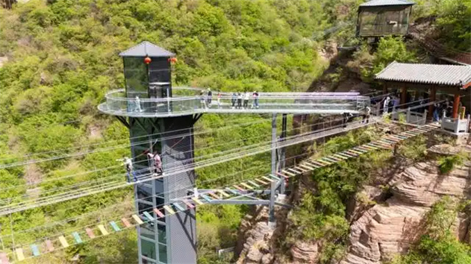 這里還上新高空索橋、崖壁滑漂兩大驚喜體驗項目。龍?zhí)洞髰{谷的高空索橋,是懸于天地間的勇氣試煉場,88米長索橫跨紅巖嶂谷,40米深淵在腳下咆哮。每一步踏出,風(fēng)撕裂云層,心跳與峽谷的呼吸共振,抬眼是千仞丹霞蒼穹碰撞的壯闊。