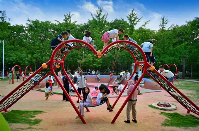 充分結(jié)合每個(gè)“口袋公園”的結(jié)構(gòu)、空間等特點(diǎn),鶴壁市量身定制,將其塑造為群眾游樂(lè)的新窗口。在優(yōu)化公園綠地建設(shè)的基礎(chǔ)上,加強(qiáng)公園游園、小微綠地等各類服務(wù)設(shè)施和場(chǎng)地適幼化改造,設(shè)置游戲區(qū)域和游憩設(shè)施,進(jìn)一步優(yōu)化群眾生活環(huán)境,提升城市生活品質(zhì)。同時(shí),積極推行“公園+”模式,實(shí)施“公園+文化”“公園+運(yùn)動(dòng)”“公園+科普”“公園+淇河書屋”等建設(shè),設(shè)置娛樂(lè)設(shè)施,如滑梯、秋千、攀爬架、沙池、健康步道等,滿足各類人群的休閑需求。