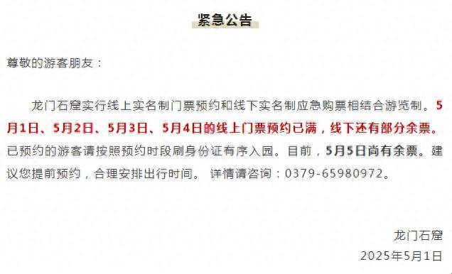 5月1日,記者從洛陽(yáng)龍門石窟景區(qū)了解到,該景區(qū)5月1日、5月2日、5月3日、5月4日的線上門票預(yù)約已滿,線下還有部分余票。目前,5月5日尚有余票。建議大家提前預(yù)約,合理安排出行時(shí)間。