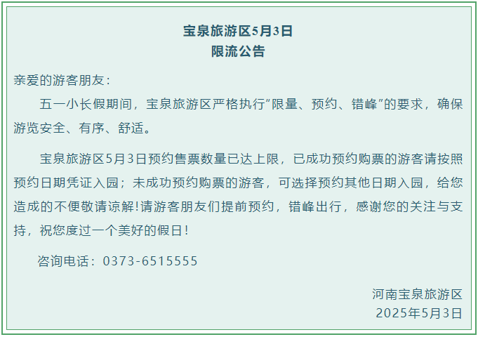 寶泉旅游區(qū)5月3日限流公告