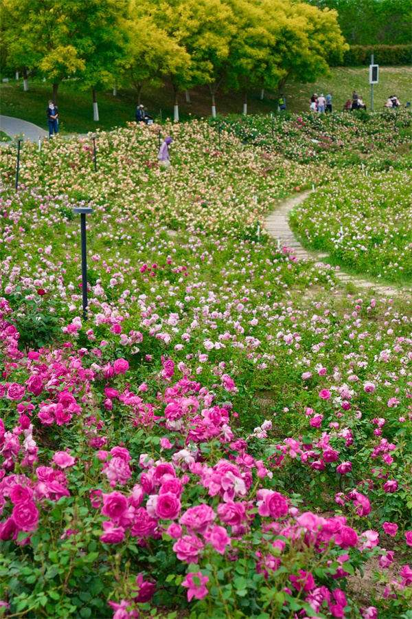 150畝月季花海,70余個品種、近五十萬株月季競相綻放,下沉式月季花海與周邊的大型月季花架相映成趣。