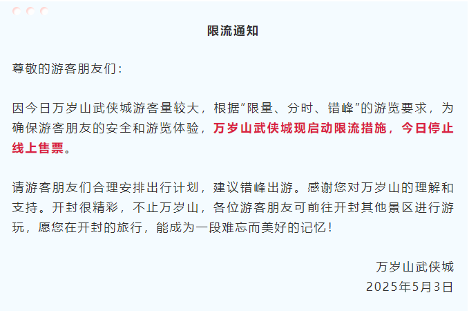 您的當(dāng)前位置:網(wǎng)站首頁 > 出行資訊 > >開封萬歲山啟動(dòng)限流措施,今日停止線上售票