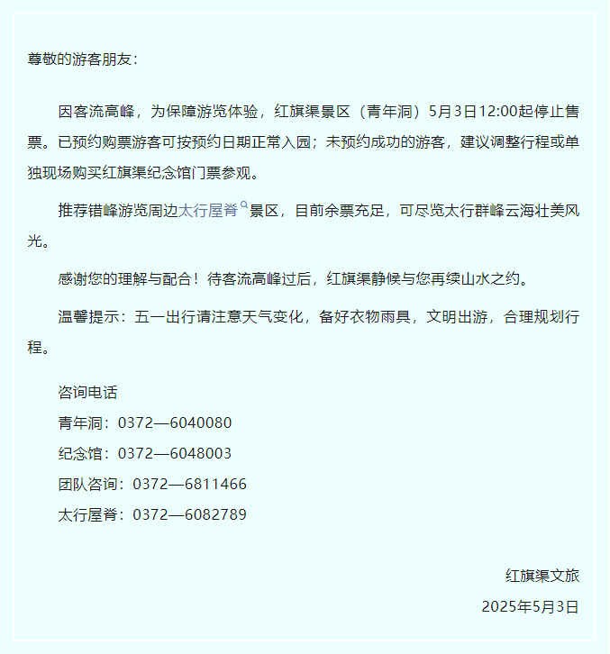 紅旗渠風(fēng)景區(qū)5月3日限流公告