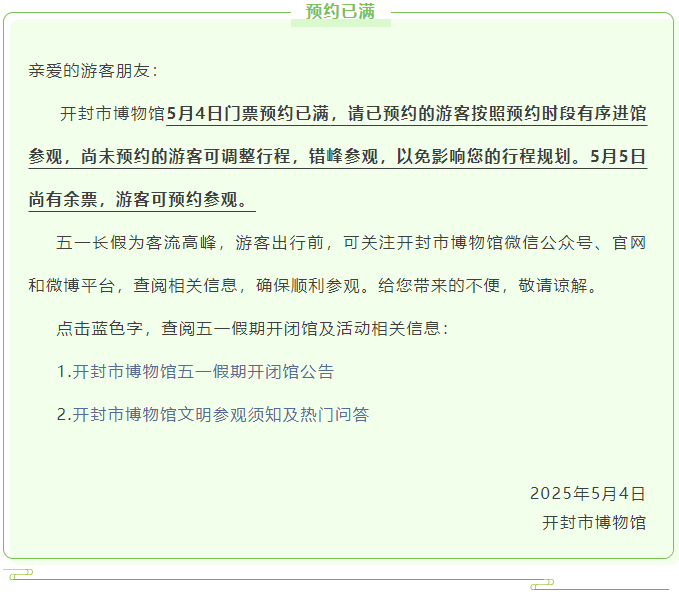 開封市博物館5月4日、5日預(yù)約情況提示及服務(wù)信息
