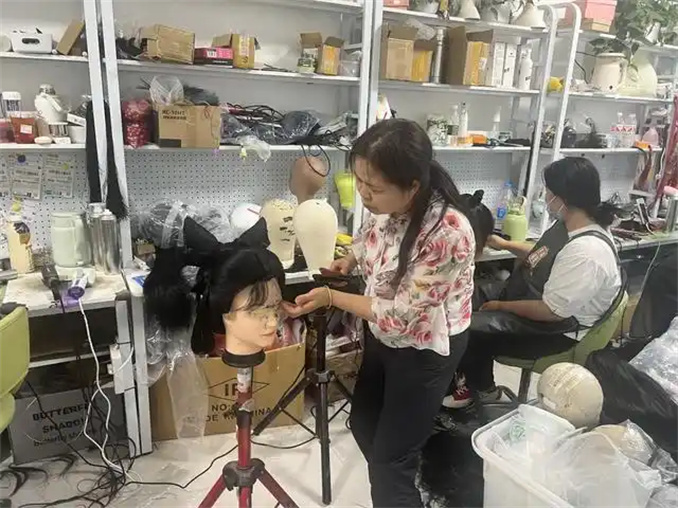 在制作過程中,團(tuán)隊(duì)將傳統(tǒng)綰絲技法與現(xiàn)代造型需求進(jìn)行了巧妙融合。獨(dú)特的貼片粘合工藝,恰似古代匠人精心編織錦繡,每一縷發(fā)絲都在“毛娘”們的手中被精準(zhǔn)定位、細(xì)致粘合。