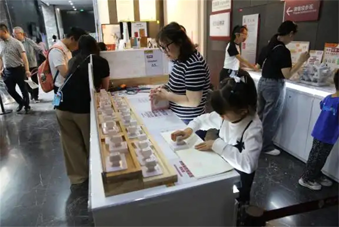 體驗豐富多彩。在宣文館的“拾趣方塊字”青少年互動體驗展廳中,小朋友用稚嫩的小手書寫古老的甲骨文字,用甲骨文元素設(shè)計屬于自己的甲骨文書簽。“傳拓古今・瓦當(dāng)新承”不僅讓小朋友們了解了瓦當(dāng)上的文字內(nèi)容和美學(xué)含義,并且小朋友們還在社教老師的帶領(lǐng)下參觀《開成石經(jīng)》拓片展,更讓小朋友們驚喜的是可以來到中國文字博物館的文物拓印工作室和文物保管員學(xué)習(xí)如何進(jìn)行拓印。同時,字博印社推出的“甲骨文水滸 108 將”主題印章吸引眾多印章愛好者來此打卡;非遺體驗活動雕版印刷吸引了大批觀眾,他們親手操作傳統(tǒng)雕版印刷術(shù),感受古代印刷工藝,古樸的甲骨文字與傳統(tǒng)印刷相結(jié)合,令人感慨中華文明傳承的智慧與創(chuàng)新活力。