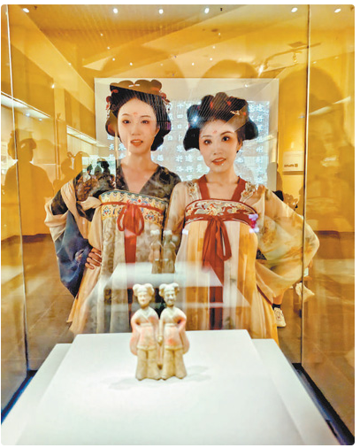 “我倆從陜西西安過來,特地穿了漢服,就是為了和‘姐妹花’合影!”展柜前,游客孫雅身著襦裙,和好友模仿女俑牽手叉腰、顧盼神飛的姿態(tài)。