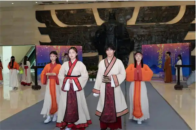 禮儀之大,服章之美,謂之華夏。在悠悠樂鳴聲中,“商王”王袍加身,威嚴(yán)沉穩(wěn);“王后”華服錦繡,端莊大氣;“貴族們”身著精致,優(yōu)雅從容;“侍女們”素雅麻衣,簡約質(zhì)樸……衣袂翻飛間,將古老文明的風(fēng)華娓娓道來。觀眾透過精心復(fù)原的服飾與生動直觀的演繹,一睹商代眾生百相。古樂繚繞間,時(shí)光的年輪流轉(zhuǎn)至唐宋時(shí)期,身著不同朝代服飾的青年依次登場,沉淀千年的文脈在古都鄭州的“城市文化會客廳”汩汩流淌,年輕一代傳承文化薪火的使命自覺,也在此刻化為具象。