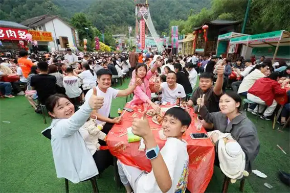16時(shí)許,山水之間盛筵開(kāi)席!數(shù)百?gòu)埌讼勺酪来闻砰_(kāi),構(gòu)成一幅壯觀的鄉(xiāng)村宴飲圖。以欒川豆腐、清香槲包等12道地方非遺佳肴依次上桌,數(shù)千名游客舉箸同歡,山水之美佐餐,非遺之韻入味。
