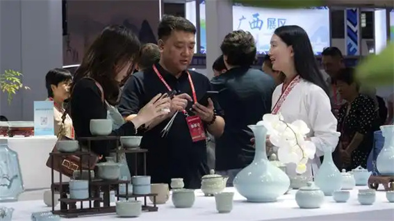 占地200余平方米的“中國(guó)汝瓷之都·平頂山”館,簡(jiǎn)約大氣的設(shè)計(jì)成為現(xiàn)場(chǎng)嘉賓、網(wǎng)紅打卡點(diǎn)。古箏二胡為樂(lè),汝瓷刻花、茶藝展示為韻,營(yíng)造出極具宋風(fēng)韻味的美學(xué)空間。館內(nèi)以汝瓷為主,花瓷、唐鈞、蒲城古陶、金鑲玉、鈦鉑汝藝瓷畫(huà)等兩千余件(套)展品,全方位展示了平頂山陶瓷的多元魅力。其中,茶器類(lèi)產(chǎn)品以及汝瓷珠手串、胸針等文創(chuàng)飾品等深受客商青睞。