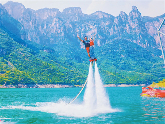 子房湖上,水上飛人凌空飛躍,驚險(xiǎn)刺激。